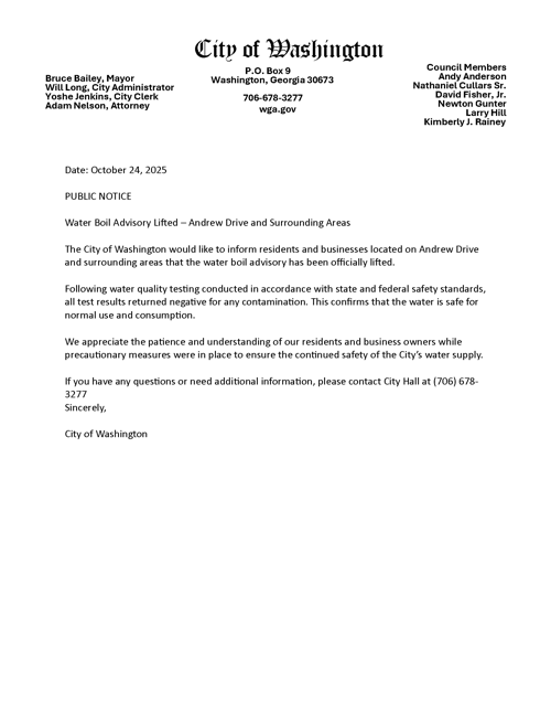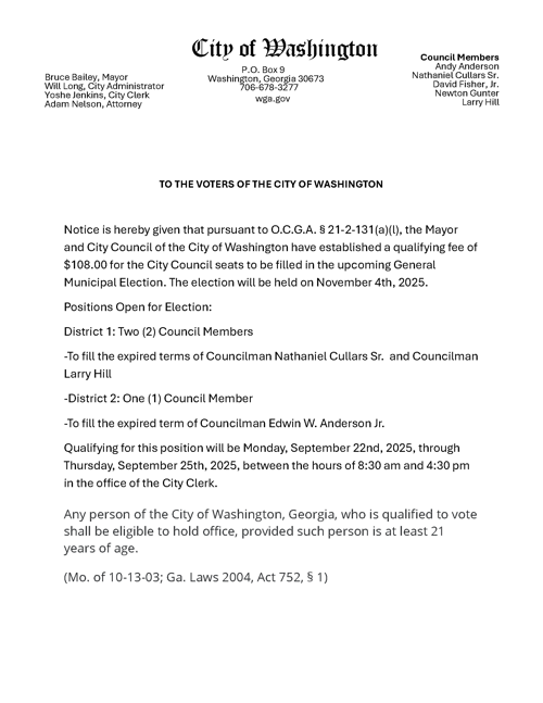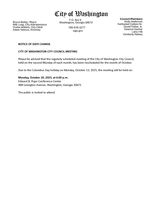 Please be advised that the City of Washington City Council Meeting is October 20th, 2025 at 6pm.