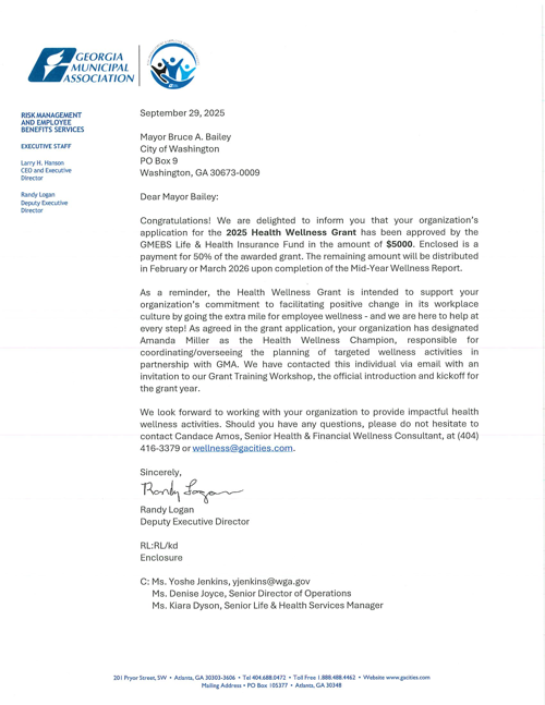 The City of Washington is proud to announce that it has been awarded the 2025 GMA/GMEBS Health & Wellness Grant. This grant recognizes the City’s ongoing commitment to fostering a healthy and positive workplace culture for all employees.
